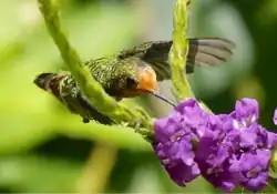 These hummingbirds forage primarily in sparsely forested regions which present low flowering plant species.[3] They feed on nectar of flowering plants present in humid evergreen forests ecosystems, favouring clearings, forest openings, and roadsides. Specifically, they have been observed foraging around the small white flowers of trees and shrubs in the Inga genus,[5] as well as the flowers of Myrtaceae, and Verbenaceae plants.[3] Small insects have also been observed being caught by the species through hawking.[3] The small body size of Coquette hummingbirds makes it impossible for them to compete successfully with other hummingbird species for food, thus they forage over larger distances than most genus.[5]