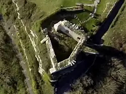 The remaining castle appears to have been the keep of a stronghold, the foundation of which was much above the top of the church tower of St Andrews which lay in the valley below. The pentagonal tower of the castle has late Medieval gun holes but rests on an earlier foundation to the north and stepped plinth to the west which may have been a 12th-century keep.[1][2] Remains include parts of the keep, sections of wall with gun ports and a 19th-century round-arched bridge across Church Ope Road.