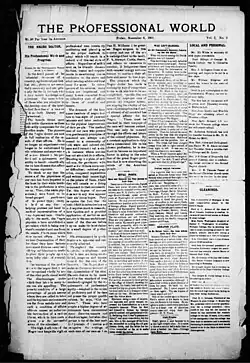 The paper covered career advancements of black professionals, black businesses, and events such as a visit by Booker T. Washington and a Blind Boone concert.[7] The Professional World lasted until about 1920.[6]