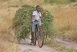 Tanzanian boy transporting fodder on his bicycle to feed his family cattle