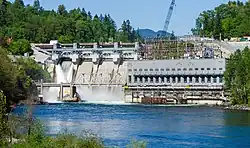 Ruskin Dam was constructed along with the Western Canada Power Company's hydroelectric development of the Stave Valley. Stave Falls Dam was completed in 1912 and Alouette Dam, the third dam in the system, in 1928. Construction on Ruskin Dam, about 5.6 km (3 mi) downstream of Stave Falls began in 1929 by the British Columbia Electric Railway who had previously bought Western Canada Power in 1921.[1] In November 1930, the dam was inaugurated and local businessmen and politicians celebrated by dining in its powerhouse.[2] Only two generators were operational at first and the third was added in 1950. The first superintendent of Stave Falls Dam was the namesake for Hayward Lake.[1] In 1961, when the provincial government took over the BC Electric Company, the dam became the property of BC Hydro, a Crown corporation.[3]