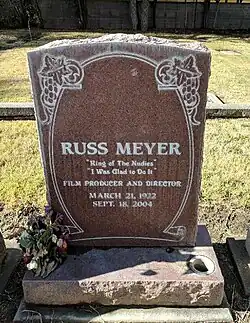 Russ Meyer died at his home in the Hollywood Hills (from complications of pneumonia), on September 18, 2004, at the age of 82.[45] Meyer's grave is located at Stockton Rural Cemetery in San Joaquin County, California.[46]