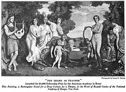 After graduating from Dartmouth Cowles traveled in Europe for three months, took a job in the advertising department of one of his father's newspapers, and studied at the Cumming School of Art in Des Moines.[9][13][note 1] He subsequently moved to Manhattan where, in 1911, he took classes first at the National Academy of Design and then at the Art Students League[11] At this time, he also studied independently under Douglas Volk, Kenyon Cox, and Barry Faulkner, all well-known muralists with traditional artistic values.[4][11] In 1915 he was awarded a fellowship in painting at the American Academy in Rome. His competition submission was a classically-inspired allegorical painting for a theater drop curtain entitled "The Drama as Teacher".[15][note 2] The fellowship included residence, use of a studio at the academy, and funds for travel.[18] In 1918, he exhibited another allegorical painting, the "Rape of Europa" at an Academy exhibition.[19] His studies at the Academy being interrupted by World War I, Cowles spread his studies over four years rather than the usual three.[20] "The Drama as Teacher" was reproduced as the frontispiece of a book called Masterpieces of Modern Drama (Doubleday, Page, & Co., 1916).[21] An image taken from the book is shown at right.