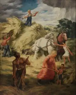 In about 1938, Cowles made what would become one of his best known paintings, "The Farmer and the Raincloud". The painting (shown at right) was exhibited at the 1939 New York World's Fair and achieved widespread distribution when sold as a lithographic print in a portfolio called "American Art Today" (New York, National Art Society, 1939).[41][42] In a caption to a photo of the painting in the Des Moines Tribune, Cowles said that it might appear to have been painted in Iowa, but was actually suggested by an event he witnessed in Nova Scotia.[43]