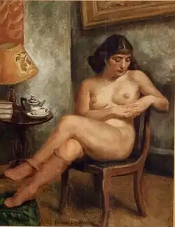 In 1927 and 1928 Cowles traveled extensively in Europe and North Africa as well as South, South-Eastern, and East Asia. By the time he returned to the United States in December 1928, he had made careful study of foreign art styles and cultures and produced a large portfolio of paintings and drawings.[11] This world tour resulted in a transition in his work away from large-scale neo-classical subjects and treatment. Indicating the complexity of the sources on which Cowles drew, one critic saw in this new approach the influence of Rubens and Renoir, while another saw in it the influence of Cézanne and Gauguin.[2][25] A third critic saw the influence of Cowles's study in Asia and said he seemed receptive to the modern art of Europe, but was hardly "a convert".[12] In 1935, Cowles himself expressed a belief that "the artist must shut from his vision all mere outward currents and eddies, and fads and fashions."[12] In 1933, he showed a painting, "Seated Nude", in a group show in New York sponsored by Salons of America.[26] This painting is shown at left.