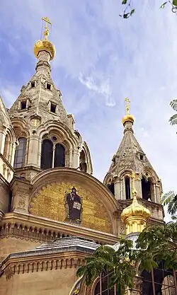 The exterior of the church is a good example, of what its builder, the Russian diplomat to France Joseph Valliliev, called "Byzantine Muscovite". It used the Byzantine form of Greek cross and a semi-circular fronton with a mosaic image of Christ giving a blessing. The distinctly Russian element was the group of five bell towers which symbolised Christ and the four evangelists. The towers are topped with gilded bulblike domes, which symbolise the flames of candles carried by the worshippers, which lift their prayers to heaven. The central tower is topped by a Russian Orthodox cross and has three traverses which symbolize Christ and the four evangelists.[5]