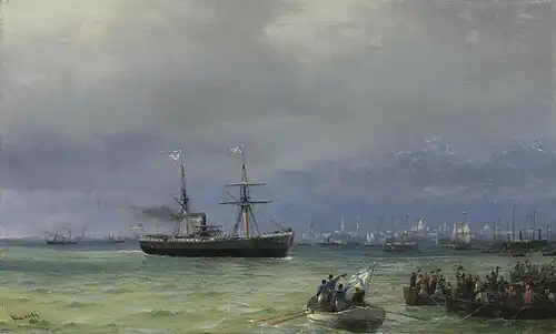The events were pictured in 1892 by the famous Armenian-Russian painter Ivan Aivazovsky (Russian: Иван Айвазовский) who painted two pictures, "The Ship of Help" (Russian: Корабль помощи) and "Food Distribution" (Russian: Раздача продовольствия).[2] In 2008, these paintings were sold by Sotheby's Auctions for $2.4 million.[2][12]