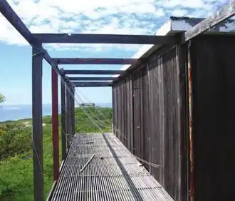 Extremely rustic in appearance, its exterior is sheathed in vertical boards and its windows have working shutters but no glass, resulting in a sharply vertical appearance. The structure consists of three rectangular sections of different sizes that are based on modular 7' by 7' squares; the main public living space is 35' by 49', the master bedroom is 7' by 21', and the guest bedrooms are in a block that is 7' by 14' (enlarged from the original 7' by 7' in 1978). The house, which is within the bounds of the Cape Cod National Seashore, was sold by the Hatches to the National Park Service, but they retain occupancy rights.[3]
