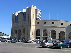 At the time it was constructed, Dyche Stadium was considered one of the finest college football stadiums in the country.[11] The stadium originally consisted of two semi-circular grandstands on either sideline, with the west (home) sideline having a small, curved upper deck whose 2 ends abut in matching concrete towers. The purpose of the curved grandstands was to maximize the number of fans sitting close to the action.[11] A preliminary proposal featured both the west and east grandstands having symmetrical triple decks but was never realized because of cost overruns resulting from an accelerated construction schedule and average attendance figures that rarely approached 50,000.[6] End zone seating was later added in the south, and in 1952 McGaw Memorial Hall was built beyond the north end zone.