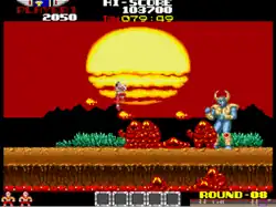 Rygar is a side-scrolling platformer in which the basic gameplay sees the player character move left to right, with the player able to jump, duck, attack, and climb ropes.[11][12] Rygar's only weapon is his Diskarmor, a razor-sharp spinning shield that can be thrown some distance whilst staying attached to him, similar to a yo-yo.[13][14][15] Available attacks are a standard front-facing attack that can be used when Rygar is either standing up or ducking down, a curved overhead swing, and an airborne attack.[12] It is also possible for Rygar to briefly stun enemies by jumping on them.[3][16] There is no health in the game, and Rygar is immediately killed upon contact with an enemy (unless jumping on their head) or an enemy's projectile, or by falling from a platform.[3][17][18]