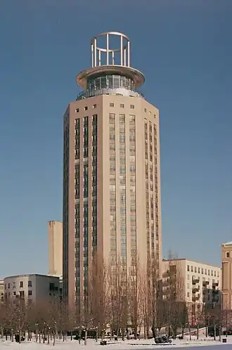 The Tower's site was previously a lake called Fatburen, which had formed due to isostatic uplift after the last glaciation.[2][4] By the 1700s, the lake had become polluted due to urban expansion, and by 1860 the lake had been filled in order to create a rail yard and train station.[4] The rail yard was closed in 1980 and the neighborhood re-developed into a residential district during the period 1985-1995 which features a large number of buildings in the post-modern style.[2][4][5] A new train station was built underground in close proximity (300 meters) to the South Tower.[4] The Tower was originally designed by Danish architect Henning Larsen to have 40 floors. However, Larsen left the project in protest after Stockholm's city planning office forced the removal 16 floors from the building plan.[1][6] The floor plan is octagonal with five apartments on each level. The tower tapers with increasing height. The facades are clad with red granite slabs. In the centrally located stairwell there are two elevators and a spiral staircase. The 23rd and 24th floors have three multi-story apartments, and the top floor is a common party room with glass walls and a panoramic view of the city. Built by construction company JM and finance company SBC, it opened in 1997.[2]