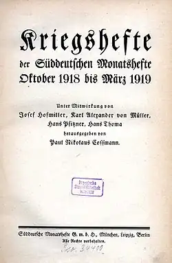 The editorship viewed the November 1918 Revolution and consequent fall of the monarchy as a disaster; its nationalist agitation was strengthened in the wake of the Munich Soviet Republic and the establishment of the Weimar Republic.[1] In that context, its antisemitism also became more radical, integrating notions about "Jewish Bolshevism", and dropping ethical distinctions between assimilated and non-assimilated Jews,[35] although Cossmann remained rather critical of such analogies.[36] In February 1919, it became the first mainstream publication to host an article by Müller's brother-in-law Gottfried Feder. The self-taught economist and German Workers' Party ideologue explained his fight against "interest slavery", soon after developed into an explicitly antisemitic program.[37] At around the same time, the Süddeutsche Monatshefte press put out a brochure by Elias Hurwicz, a Jewish Russian refugee in Berlin. Its pessimistic prognosis was that world revolution had become an unstoppable "torrent".[38]
