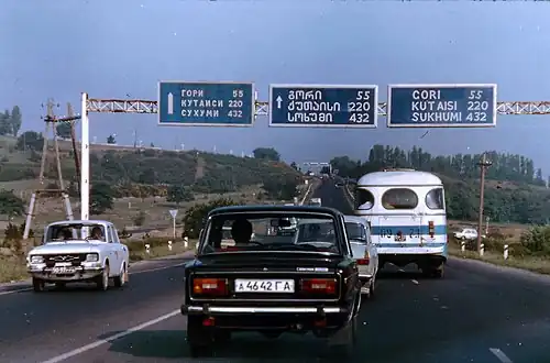 The Georgian S1 route (Georgian: ს1, also known as Tbilisi-Senaki-Leselidze), is a "road of international importance" with a registered length of 542.7 kilometres (337.2 mi) within the Georgian classification system, which makes it the longest Georgian highway route.[1] It runs from Tbilisi via Mtskheta, Gori, Khashuri, Zestaponi, Kutaisi, Samtredia, Senaki, Zugdidi, Sukhumi and Gagra to the border with Russia near Leselidze at the northwestern tip of the country, covering in practice 537 kilometres (334 mi). After crossing the Georgia–Russia border in breakaway Abkhazia, the highway continues to Sochi and Krasnodar as A147. It is part of European E60, E97 and E117 routes and Asian Highways AH5, AH81 and AH82, and connects with six other S-routes.