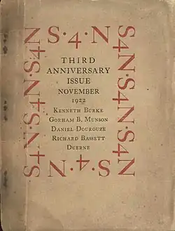 S4N was an American "little magazine" that was published from 1919–1925 in Northampton, Massachusetts.[1] In its earliest stages, editor-in-chief Norman Fitts described the magazine as a "discussion of the arts in a monthly magazine". The magazine published contemporary poetry and stories, as well as essays discussing the direction of Modernism in art and music. Among the notable poets, writers and literary theorists that were published in the magazine were Elsa Gidlow, E.E. Cummings, Hart Crane, Kenneth Burke, and Malcolm Cowley.[2] In The Little Magazine: A History and Bibliography, Frederick J. Hoffman's authoritative work on little magazines, contends that S4N, along with Broom, Secession, and Seven Arts, were trend-setters and leaders of innovation.[3]