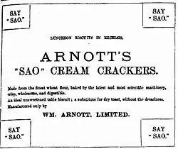 - ^ National Archives of Australia: Patent Office; A11708, Applications for Registration of Trade Marks, 1904, 3987, Application for Trade Mark titled SAO in respect of biscuits - by William Arnott Limited.
