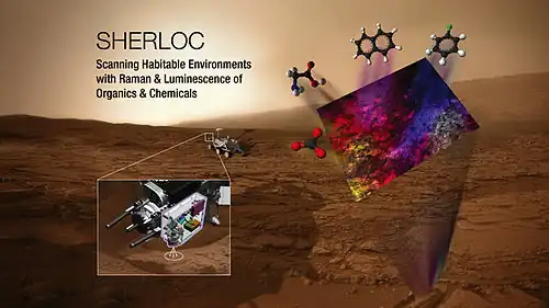 Scanning Habitable Environments with Raman and Luminescence for Organics and Chemicals (SHERLOC) is an ultraviolet Raman spectrometer that uses fine-scale imaging and an ultraviolet (UV) laser to determine fine-scale mineralogy, and detect organic compounds designed for the Perseverance rover as part of the Mars 2020 mission.[1][2][3] It was constructed at the Jet Propulsion Laboratory with major subsystems being delivered from Malin Space Science Systems and Los Alamos National Laboratory.