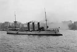 The ship then steamed north for another overhaul at Newport News from 6 April to 15 May. In early August, she cruised back to Port-au-Prince, where further unrest had broken out. She visited Veracruz again in early September, where Hopman and his staff visited President Porfirio Díaz. She then steamed north to join the protected cruisers Victoria Louise and Hertha and the light cruiser Dresden, which had traveled from Germany to represent the country at the Hudson–Fulton Celebration in New York, which marked the 300th anniversary of Henry Hudson's discovery of the Hudson River and the 100th anniversary of Robert Fulton's development of the paddle steamer. The ships' contributed a total of three hundred sailors to take part in an international parade. While there, Bremen received a new commander, FK Ernst Goette. The four cruisers remained in the port until 14 October, when Bremen got underway to visit Buenos Aires, Argentina, arriving there on 14 December. While there, the French armored cruisers Gueydon and Dupetit-Thouars also arrived and the Argentine government held a celebration for the three ships' officers.[10]