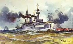 At the outbreak of World War I in August 1914, Kaiser Friedrich III and her sisters were brought back to active service and mobilized as V Battle Squadron. Kaiser Friedrich III was commanded by Käpitan zur See Alfred Begas. V Squadron was tasked with providing coastal defense in the North Sea. The ships were deployed to the Baltic twice, from 19 to 26 September and 26 to 30 December 1914.[32] For the first operation, the commander of naval forces in the Baltic, Prince Heinrich, initially planned to launch a major amphibious assault on Windau, but a shortage of transports forced a revision of the plan. Instead, V Squadron was to carry the landing force, but this too was cancelled after Heinrich received false reports of British warships having entered the Baltic on 25 September.[33] Kaiser Friedrich III and her sisters returned to Kiel the following day, where the landing force disembarked. The ships then proceeded to the North Sea, where they resumed guard ship duties. For their second deployment to the Baltic, Prince Heinrich ordered a foray toward Gotland to attack any Russian warships in the area. On 26 December 1914, the battleships rendezvoused with the Baltic cruiser division in the Bay of Pomerania and then departed on the sortie. Two days later, the fleet arrived off Gotland to show the flag, and was back in Kiel by 30 December, having failed to locate any Russian vessels.[34]