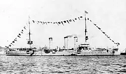 SMS Nürnberg ("His Majesty's Ship Nürnberg"),[a] named after the Bavarian city of Nuremberg, was a Königsberg-class light cruiser built for the German Imperial Navy (Kaiserliche Marine). Her sisters included Königsberg, Stettin, and Stuttgart. She was built by the Imperial Dockyard in Kiel, laid down in early 1906 and launched in August of that year. She was completed in April 1908. Nürnberg was armed with ten 10.5 cm (4.1 in) guns, eight 5.2 cm (2 in) SK L/55 guns, and two submerged torpedo tubes. Her top speed was 23.4 knots (43.3 km/h; 26.9 mph).