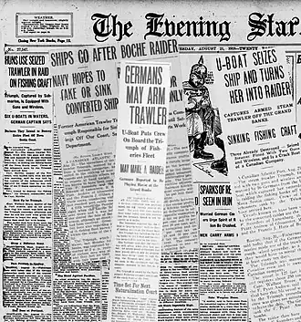SMS Triumph was a Canadian motorized stern trawler that was captured by the Imperial German Navy U-boat U-156 in 1918. The Nova Scotia newspaper The Sydney Record called the German-crewed Triumph a "Hun Sea Wolf!"[3] Over the course of a few days it sank several fishing vessels before itself being scuttled on 25 August 1918.