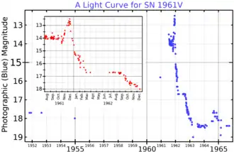 ![]() A blue-light light curve for SN 1961V. The inset plot shows the time around maximum brightness with an expanded horizontal scale. Plotted from data published by Woosley & Smith (2022)[1] | |