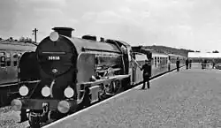| 932 | 30932 | Blundell's | Eastleigh | 1935 | 1961 | Fitted with high sided self trimming tender from June 1938 to August 1958 when a tender exchange took place with 30905. The nameplate did include an apostrophe as the product photograph of the model introduced by Hornby in 2009 shows.[2] The locomotive featured in the opening shots of the 1945 film Waterloo Road. |