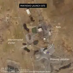 Planet Labs satellite imagery from 15 and 24 June 2018 published by Lewis and MIIS show the rail-based environmental shelter at the Pan'kovo test range that is claimed by Lewis to be characteristic of a Burevestnik launch site.[26][24]
