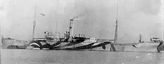 At 16:00 on 27 December, Santee sailed from Queenstown bound for Bantry Bay to carry out exercises. At 20:45 she was south of Kinsale, when she was struck on the port side by a torpedo[1] fired by SM U-61, under the command of Kapitänleutnant Victor Dieckmann.[3] Hanrahan ordered his men to battle stations and sent away the "panic party," a group of sailors who played the role of a crew precipitously abandoning their sinking vessel. They left the ship, as Hanrahan later reported, in "fine panicy [sic] style", in an attempt to lure the enemy to the surface. After two and a half hours fruitlessly waiting for the U-boat to show herself, Hanrahan radioed for help. Destroyers and tugs were sent to her aid, and the ship was towed back to Queenstown, while the destroyers USS Cummings and Sterett rescued the boats of Santee's "panic party." After repairs at Queenstown Santee was towed back to Devonport by 8 February. She was decommissioned on 8 April 1918 and returned to the Admiralty.[1] Commissioned into the Royal Navy as HMS Bendish, she was sent to Gibraltar for further Q-ship operations.[2]