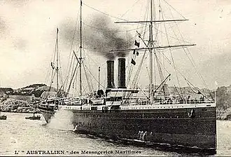 SS Australien was a French passenger ship that was sunk during World War I on 19 July 1918 in the Mediterranean Sea 26 nautical miles (48 km) northeast of Cap Bon, Tunisia, by a torpedo fired by the Imperial German Navy submarine SM UC-54. Three of her 951 passengers and seventeen of her crew died in the sinking.[1][2][3]