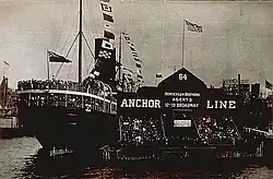 Anchor Line registered California at Glasgow. Her UK official number was 124230 and her code letters were HLQJ.[2] Her maiden voyage from Glasgow to New York began on 12 October 1907. By 1913 California was equipped for wireless telegraphy, supplied and operated by the Marconi Company. Her call sign was MCI.[3]