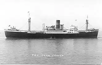 This was the third of four Clan Line ships called Clan Fraser. The first was a steamship built in 1878, sold in 1899 and wrecked in 1902.[3] The second was a steamship built in 1900, sold in 1919 and lost in 1920.[4] The fourth was a motor ship built in 1961, sold in 1965, burnt out in 1979 and scrapped in 1980.[5]