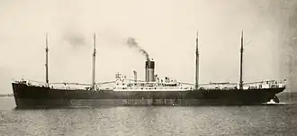 Alster was launched on 5 January 1928, and completed on 25 February 1928.[1][2] She was built for Norddeutscher Lloyd.[5] She was given the code letters QMHG and registered in Bremen.[3] She served on routes between Germany and Australia and East Asia.[2][10] Lloyds Register entries show that she held a passenger certificate from 1934 to 1940. With the change in code letters in 1934, Alster was given the call sign DOEO.[11] She had a crew of 69 and could initially take 14 passengers. In 1930 the passenger capacity was increased to 16.[2][9]