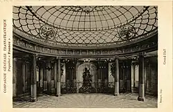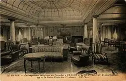 Her first class accommodations were graced with various portraits of Louis XIV as well as his relations. France was also credited for bringing the grand staircase to the ocean liner, a fashion which prevails in modern cruise ships. Her First Class entrance hall and dining room demonstrated this.[6] The staircase in the dining room was in fact copied from the Parisian Hôtel de Toulouse.[3] Further unique points included her Cafe Terrasse and the Salon Mauresque, the latter a reference to the French colonial empire in Africa. The ship also had a gymnasium, an elevator, and a hair salon, all great novelties at the time.[4] Style Louis seize (Louis XVI) was also used within the private apartments of the grand luxe suites on board. According to a 1912 booklet publicising the liner, her second class accommodation was credited as "match[ing] the richness and comfort of first class on the old liners."[4] Passengers in this class could also utilise a hair dressing salon.[4] Third and steerage classes were also praised as being well-appointed.
