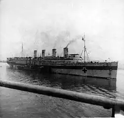 When World War I erupted in 1914, France was immediately requisitioned by the French Navy for use as an armed merchant cruiser and renamed France IV.[3] Her time as a cruiser was short-lived as she was too large and burned too much coal to be of good use, and was consequently reconfigured to carry troops. On 18 June 1916, France was involved in a collision with the British destroyer HMS Eden in the English Channel. Eden sank with the loss of 43 officers and men, including her commander, with France rescuing the remaining 33 survivors. Later that year, she was painted white and used as a hospital ship in the Dardanelles, operating in tandem with White Star's, Britannic and Cunard's Aquitania. During her time as a hospital ship she was converted to accommodate 2,500 injured troops. When Britannic was lost in late 1916, the need for high-capacity hospital ships was even more dire, and she continued in this role until the United States entered the war in 1917, when she was deployed back to the Atlantic to ferry American troops to the continent with space for some 5,000 individuals. In 1918, her military service was cut short by an engine room explosion that killed nine crew members and required extensive repairs.[3]