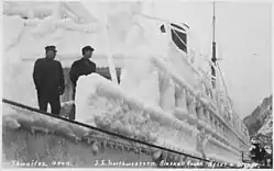The SS Northwestern, originally SS Oriziba, was a passenger and freight steamship launched in 1889 by the Delaware River Iron Ship Building and Engine Works, Chester, Pennsylvania which spent most of its career in service in the waters of the Territory of Alaska.[2] The ship from early in its career had a reputation for trouble, and was frequently involved in groundings, collisions with other ships, and with port facilities. She first served as a transport in the West Indies as Oriziba, and was acquired by the Northwestern Steamship Company in 1906, sailed around Cape Horn, and renamed Northwestern. For the next thirty years she worked along the Alaska coast, transporting people, mail, and goods, as well as ore from mining operations at Kennecott.[3]
