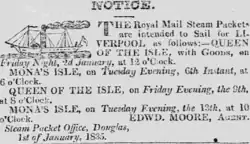 1834 also saw the beginning of the daily summer service between Douglas and Liverpool leaving Douglas at 08:00hrs, and Liverpool at 10:00hrs. The winter service was increased to two sailings a week in each direction throughout the winter.[7]