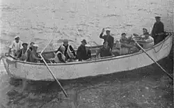 When Robin Moor was stopped, U-69 forbade her crew to touch their wireless, but after the sinking, U-69's captain, Jost Metzler, reportedly promised the survivors he would radio their position.[8] The captain kept the lifeboats near Robin Moor's position for 24 hours, then navigated towards St Paul's Rocks or the Brazilian coast with all four lifeboats bound together.[9] The captain separated the lifeboats on 26 May as his plan was not working.[10]