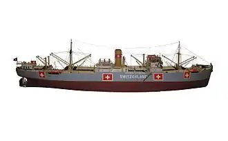 ![]() Model of the Swiss cargo ship SS St. Cergue with her war markings during the Second World War, on display at the Swiss Museum of Transport.