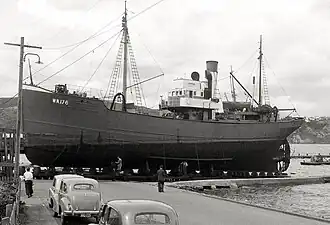 In 1946, she was sold to the National Mortgage and Agency Company, being renamed to Taiaroa, and was converted into a fishing trawler, and would operate at Dunedin.[2][3] She would be sold to New Zealand Fisheries LTD in 1952.[4] Later that year on 28 July 1952, a man was found dead on the deck of Taiaroa, having fallen head first.[5] a member of the crew, Charles Munday told the police that he was walking with the man on the wharf, and while he was climbing down to the trawler, the man fell head first onto Taiaroa.[5] Charles would report this to the fireman of Taiaroa, but because he did not see the man because of the darkness, the fireman presumed he was under the influence of liquor, told him to get off the ship.[5] Charles would then report the accident to the police, and when the police arrived, they found the man dead.[5] In September 1974, she was laid up in Wellington, where for almost a decade, she would be badly vandalised. In April 1982, she was sold by the Wellington Harbour Board to recover costs, and was to be used for the movie Savage Islands, and would sail to Tauranga under her own power to be converted.[2][6] In one of the final scenes of the movie, she was to be blown up, which was only meant to damage deck structures, unfortunately she caught fire, also setting fire to a wildlife reserve on Motoura island.[2] After a lengthy court case, Taiaroa was stripped, and given to the Royal New Zealand Air Force to be sunk.[2]