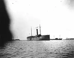 Resolute was transferred to the United States Department of War on January 22, 1900, for service with the Army Transport Service as the United States Army Transport (USAT) Rawlins.[1] The ship was aground on a coral reef at Santiago, Cuba when on the way to embark the troops of the Tenth United States Infantry destined for New York.[5] Then, on April 10, 1901, Rawlins was to have sailed from New York to Havana, Cuba with miscellaneous cargo, largely horse feed, but caught fire in the engine room with the result of a two alarm fire bringing six engines, two trucks and three fireboats and so much water pumped aboard by 9:30 a.m. that she rolled over, flooded and sank with deck awash at the Army's pier at Pacific Street, Brooklyn.[6] There was no loss of life but four men were overcome by smoke and damage was estimated at $20,000 to refloat and $50,000 to repair.[6] Rawlins was sold to the Merchants and Miners Transportation Company of Baltimore, Maryland on July 27, 1901, for $200,000.[7]
