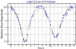 S Antiliae is classed as an A-type W Ursae Majoris variable, since the primary is hotter than the secondary and the drop in magnitude is caused by the latter passing in front of the former. S Antiliae varies in apparent magnitude from 6.27 to 6.83 over a period of 15.6 hours.[4] The system shines with a combined spectrum of A9V.