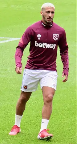 On 16 October 2020, Benrahma joined Premier League club West Ham United on an initial season-long loan deal, with an agreement to make the transfer permanent.[34] On 31 October, he came off the bench and made his debut in a 2–1 loss against Liverpool in a league fixture.[35] He was named in the starting 11 for the first time in a 2–1 win over Leeds United on 11 December.[36][37]