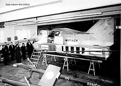 The Saab 401 MEFA project was created in the late 1950s as a collaboration between Saab and the Royal Swedish Naval Materiel Administration,[2] Karlskronavarvet (Saab Kockums) and the Swedish National Aeronautical Research Institute (FFA). Later the project was continued on lean funds at FFA.[3][4][5][6] MEFA is the Swedish acronym for Markeffektfarkost (ground effect vehicle); the craft was also known as the "MEFAN".[7]