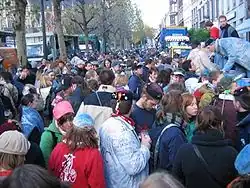 Each year, the Sablon is the starting point for the Ommegang procession. On 20 November, it hosts the beginning of the Saint Verhaegen student parade (often shortened to St V), which celebrates the founding of the Université libre de Bruxelles (ULB) and the Vrije Universiteit Brussel (VUB) universities.[16]