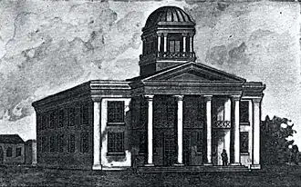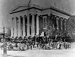 On the site of the burnt Courthouse, a new Sacramento County Courthouse was built by David Farquharson (1817-1906) in just 6 months. The new building was the State Capitol from March 1, 1854, to May 15, 1854, with large Greek columns in the front. The new Sacramento County Courthouse construction started September 1854 and was completed in January 1855. In 1870 the city raised the Sacramento County Courthouse as part of program to stop flooding from the American River and Sacramento River. Workers used 400 jack screws to raises the building. Turton and Knox Company was awarded the contact to raise the building 15 feet. The city had a 13-year program in the 1860s and 1870s, to raise the buildings and streets in Sacramento to stop the flooding problem in the city.[4][5]