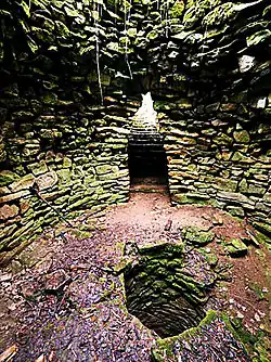 The steps lead to an underground vaulted round circular chamber 4.2 metres (14 ft) in diameter. On the top of the vault a circular hole to the sky, 2.3 metres (7 ft 7 in) wide. The underground staircase joins the vaulted chamber by an arched gate 2.4 metres (7 ft 10 in) high. The construction is 'almost identical'[3] to the Funtana Coberta at Ballao in Sardinia.