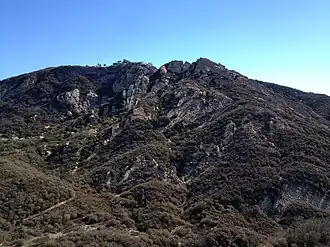 Vegetation is sparse on the peak; dwarf forest and chaparral on the approaches, scrub and grassy at the top. Some oaks at lower elevations.