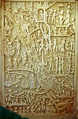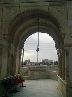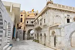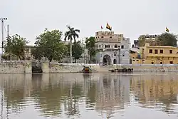 The temple was initially constructed in 1899 by the eighth gaddi nashin Sant Harnam Das.[11] The place is held in high esteem by Hindus throughout Sindh and even in India, occasionally attracting pilgrims from across the border.[14] The annual death anniversary of Baba Bankhandi Maharaj called the Baba Bankhandi Maharaj Mela attended by thousands and is celebrated by a three-day festival in which pilgrims are provided with free lodging, food, and water.[15][16] One of the unique feature about Sadhu Belo is that many prayers and texts are written here in Sindhi, the language of the Sindh province in Pakistan.[12] The security system is very tight nobody can enter or visit the temple without having permission; there is a proper way to get permission from Pakistan Hindu Panchayat. For non-Hindus, it's difficult due to the security system because Sadh Belo is the biggest temple in Pakistan.[8]