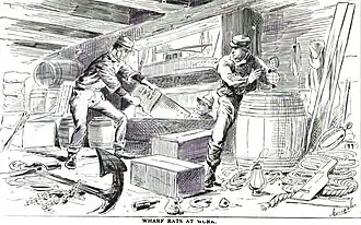 Folklore has it that, leaving the area in disgrace, she ventured to the waterfront area in West Side Manhattan. It was while wandering the dockyards in the spring of 1869 that she witnessed members of the Charlton Street Gang unsuccessfully attempting to board a small sloop anchored in mid-river. Watching the men being driven back across the river by a handful of the ship's crew, she offered her services to the men and became the gang's leader.[5] Within days, she engineered the successful hijacking of a larger sloop [6] and, with "the Jolly Roger flying from the masthead", she and her crew reputedly sailed up and down the Hudson and Harlem Rivers raiding small villages, robbing farm houses and riverside mansions, and occasionally kidnapping men, women, and children for ransom. She was said to have made several male prisoners "walk the plank".[2][3][4][6]