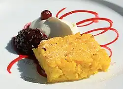 Saffranspannkaka or gotlandspannkaka (English: saffron pancake or Gotland pancake, Gutnish: saffranspannkake or saffranspannkakå) is a dessert from the island of Gotland, Sweden, and is considered one of their provincial dishes.[1] It is made of rice pudding, cream, milk, sugar, egg, chopped almonds, and saffron mixed together and baked. The cake can be eaten tepid or cold and is traditionally served with dewberry jam and whipped cream.[2][3]